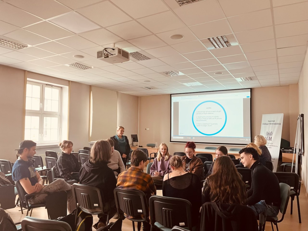 U nastavku susreta razgovaralo se o njezinim pjesmama koje su studenti preveli na poljski jezik. Raspravljali su o prijevodnim izazovima, a najviše su ih mučile kulturne nijanse, specifične metafore i pronalaženje odgovarajućih riječi koje bi zadržale originalnu emociju pjesme. Analizirali su različite prijevodne mogućnosti, a posebno su se fokusirali na očuvanje stila i ritma izvornih pjesama. Razgovor je bio vrlo interaktivan i poticajan, uz aktivno sudjelovanje svih prisutnih studenata.